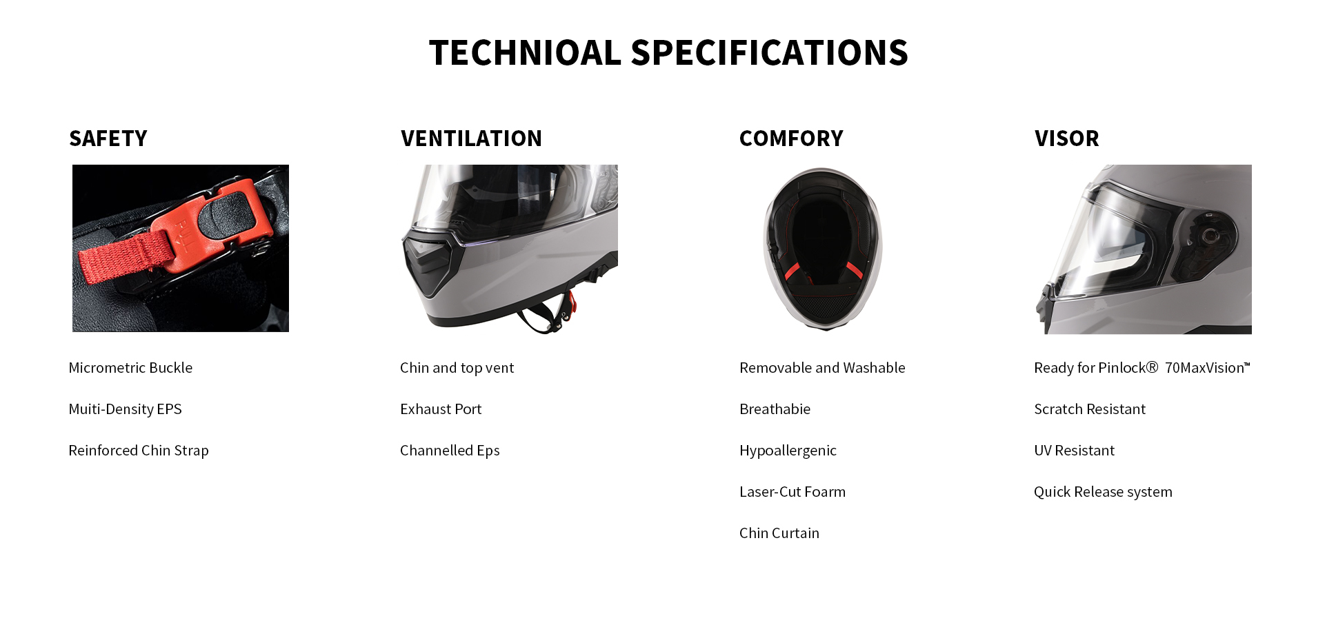 Racing spoiler for maximum aerodynamics.Double Visors full face helmet,resistant with ABS709 shell.Excellent peripheral vision.Emergency release cheek pad system.Wide anti-scratch visor prepared for the anti-fog system,Pinlock Max Vision.